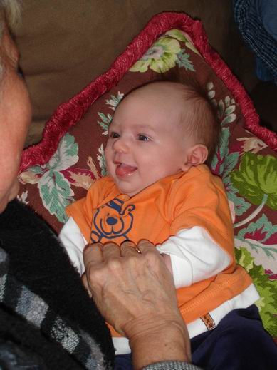 Dear Family & Friends, "All's quiet in the western front"... actually, life is beginning to be enjoyable again. A bit more 'rustig' (quiet, calm). Margreet has had her last radiation therapy. It is now a time of letting go and let the thing do the work. The radiation and the angels (and the prayers, visualizations, energy directing and all those things you folks have been doing). The doctor warned us that during the next 2 weeks she may experience deep fatigue and exhaustion, as well as other negative effects from the therapy. So far she's not been too tired, only after some activity she needs to rest for a while, but she's already contributing to the workings of the family as much as she can with one arm unwilling to cooperate. Meanwhile, her hair has begun to fall out. She says she doesn't mind it. Rather be bald than nauseous. This week she planning a trip to Hilversum with two of her dear girlfriends to look for some head gear. (one of them said something that sounded like "drie slits zoeken een moet", does that sound like anything to you?... Hey! I'm just the scribe here.) Tomorrow she'll begin her physiotherapy. She wants to regain the use of her arm and be able to walk by herself. It's extremely frustrating for her not being able to go an comfort a crying baby or play with Arianna so that Mom can do her work around the house. I have my fingers crossed for her to succeed. Meanwhile, here's a photo of oma and Ryan. Love. Bob